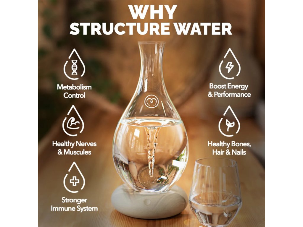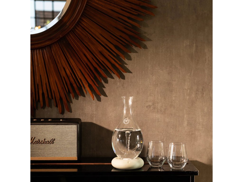 Voda si pohybem zachovává svou živost a svěžest, ale když je stlačená a stagnuje v potrubí, ztrácí energii, vitalitu, kterou vaše tělo potřebuje k plné hydrataci. Stejně jako víno potřebuje dýchat, aby se projevila jeho nejlepší chuť, vířivý pohyb v karafě obnovuje ztracenou vitalitu tím, že přivádí kyslík a vyrovnává a alkalizuje skutečnou chuť a strukturu vaší vody (zvyšuje pH - rozpuštěný CO2 způsobuje chemickou reakci, která zvyšuje pH) - pouze 6000krát rychleji než běžná karafa.